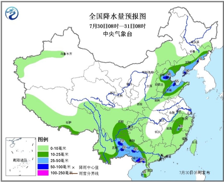 相比高温控制的大范围面积,暴雨影响的区域较为集中。预计今天白天到夜间,华北东部、东北地区南部、山东北部、广西西部和南部、海南西部、云南南部和东部等地有中到大雨,其中,广西南部和西部、云南东部、河北东部、辽宁南部等地的部分地区有暴雨,广西南部沿海局地大暴雨(100~160毫米);上述局地并有短时雷暴大风或冰雹等强对流天气。
