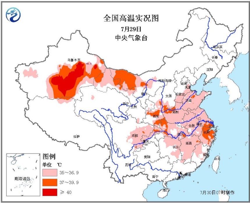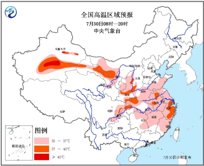 预计7月30日至8月1日,受副热带高压影响,黄淮大部、江淮、江汉、江南中东部等地将持续35℃以上的高温天气,部分地区最高气温37~39℃,中央气象台继续发布高温黄色预警。
